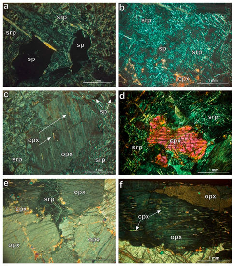 Serpentinized peridotites from the Veria-Naousa ophiolite complex are characterized by mesh and local bastitic or cataclastic textures. The primary mineralogical assemblage of serpentinized lherzolite has been mostly obliterated by alteration and only a few relics of olivine, orthopyroxene, clinopyroxene and spinel (Al-spinel and Cr-spinel) are present (Figure 3a,b). A scarce network of calcite veinlets occurs as well. The primary assemblage of the harzburgite comprises relics of orthopyroxene, rare clinopyroxene, olivine, as well as spinel (magnesiochromite and Cr-spinel). Orthopyroxene appears as subhedral porphyroclasts and most of them show exsolution lamellae of clinopyroxene, a typical feature of mantle peridotites. The existence of intense fragmentation of spinel and the presence of intragranular microcracks indicate brittle deformation. Serpentine consists of the main alteration product, showing mainly mesh, bastitic and interpenetrating textures (Figure 3c,d). Chlorite and magnetite are the minerals, which complete the secondary assemblage of the harzburgite. The ol-orthopyroxenite is the least altered lithology and generally presents coarse, granular to porphyroclastic texture. It consists mainly of orthopyroxene, rare clinopyroxene, olivine and spinel. Orthopyroxenes exhibit local kink bands, undulatory extinction and frequent exsolution lamellae of clinopyroxene (Figure 3e). Serpentine is the dominant alteration product forming mesh texture (Figure 3f). Lesser amounts of chlorite, talc, anthophyllite and magnetite occur [36].