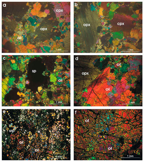 Photomicrographs of: (a,b) porphyroclastic and cataclastic textures of lherzolite with porphyroclasts of orthopyroxenes showing kink banding, crystals of olivine and clinopyroxene showing undulatory extinction (sample GE.25, GE.32, XPL); (c) spinels with embayed margins in cataclastic harzburgite (sample GE.28, XPL); (d) porphyroclasts of orthopyroxene and olivine crystals with undulatory extinction in harzburgite (sample GE.28, XPL); (e) granular texture of fine grained dunite with a low percentage of serpentine (sample GE.17, XPL); and (f) granular texture of dunite (sample GE.34, XPL). Abbreviations: ol: olivine; opx: orthopyroxene; cpx: clinopyroxene; srp: serpentine; sp: spinel.