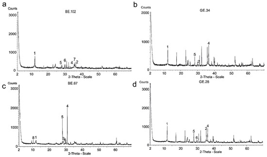 - Bish, D.L.; Post, J.E. Quantitative mineralogical analysis using the Rietveld full pattern fitting method. Am. Mineral. 1993, 78, 932–940. [Google Scholar]
