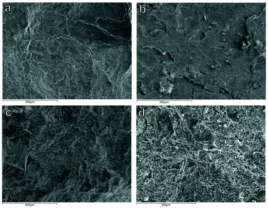 The surface texture of the studied rock samples from both Veria-Naousa and Gerania ophiolite complexes were investigated by using secondary electron images. The particle surfaces of the studied samples presented differences in their microtopography. Highly serpentinized rocks were characterized by smooth and glassy surface textures (Figure 6a,b). With the decreasing of serpentinization, the surfaces of rock particles appeared rougher, due to the presence of minerals of differential hardness, hence resulting in development of rugged and irregular surfaces (Figure 6c,d).