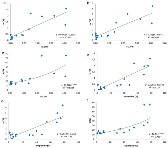 Common secondary phases in ultramafic rocks include serpentine, talc, chlorite and magnetite. However, the investigated ultramafic rock samples included serpentine as a secondary mineral in dominant contents, while chlorite, talc, brucite and magnetite were presented in minor amounts. Very good positive correlations were observed when only serpentine contents were plotted against the porosity, moisture content and soundness test (Figure 7d–f), hence suggesting that this mineral played a determinant role among the secondary minerals and strongly controlled the SEC/PR ratio. The linear equations below fitted better the abundance of serpentine with the moisture content and the total porosity: