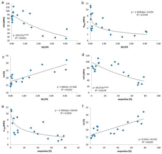 (a) The uniaxial compressive strength [UCS (MPa)] plotted against the ratio of secondary SEC/PR of all tested rock samples; (b) the point load test [Is(50) (MPa)] plotted against the ratio of SEC/PR of all tested rock samples; (c) the Los Angeles abrasion test [LA (%)] plotted against the ratio of SEC/PR of all tested rock samples; (d) the UCS (MPa) plotted against the abundance of serpentine (%) of all tested rock samples; (e) the point load test [Is(50) (MPa)] plotted against the abundance of serpentine (%) of all tested rock samples; (f) the Los Angeles abrasion test [LA (%)] plotted against the abundance of serpentine (%) of all tested rock samples.