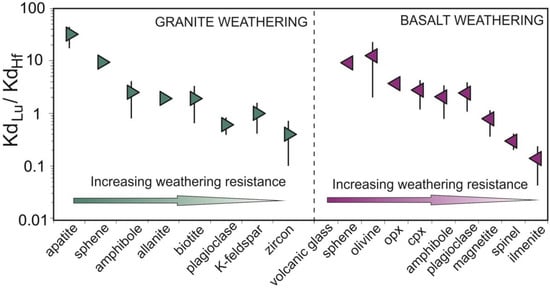 Partition coefficients (Kd) for Lu and Hf between melt and minerals in granitic and basaltic systems sorted after weathering resistance of individual minerals (adapted and slightly modified from [29]).