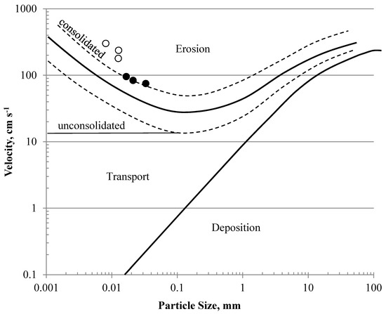 Hjulström [38] and Shields [39] demonstrated that erosion (entrainment) resistance increased for cohesive materials above those of granular non-cohesive materials. Shields used dimensionless parameters for grain size and shear stress and determined regions of motion and no motion. Hjulström’s diagram (Figure 5) segregated process-based regions from erosional to depositional conditions for grains as small as 0.001 mm (1 μm). Velocities required to entrain grains ranged widely between unconsolidated and consolidated materials and was defined as the region between the dashed lines. For example, an unconsolidated particle of size 0.01 mm would move with a velocity of ~30 cm s−1 rising to >100 cm s−1 if it were consolidated. Although equations exist to determine entrainment velocities for granular materials >0.1 mm, few equations exist for clay particles.
