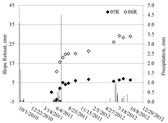 Slope retreat data for 2 slopes at site BL-01 for approximately 2 years. Slope 05R utilized erosion pins and slope 06R utilized steel rules. Precipitation is shown as lines.