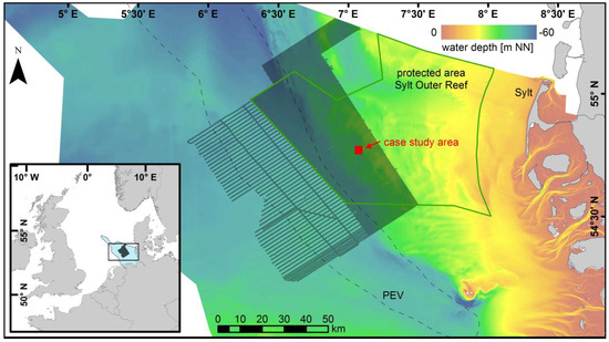 The study site is located in the German Bight, 60–130 km west of the northernmost German island Sylt (Figure 1). Several glacial advances and retreats during the Saalian [23,24] and earlier glaciations shaped the seafloor and left complex sequences of glaciofluvial and glacial deposits e.g., [24,25,26]. During the last glacial phase, the Weichselian (sea level −130 m below present), the German Bight was not covered by ice [24]. At this time the western part of the study area was cut by the paleo Elbe valley (PEV, Figure 1), an approximately 16 m deep and 30–40 km wide valley which discharged large amounts of melt water in north-westerly direction [27,28,29]. The eastern flank of the valley is marked by Pleistocene moraine deposits (including stones up 1.5 m in size) that were exposed to subaerial processes until the sea level rose to 40 m below the present, around 10 ka BP. During the Holocene sea-level transgression, the PEV and the adjacent Pleistocene deposits were submerged. Eventually, the valley filled with Holocene marine sediments [28], whereas part of the moraine deposits is still visible at the seafloor or covered only by a relatively thin layer of sand [30]. As a result homogeneous fine sands characterize the modern sediment surface of the PEV. Heterogeneously distributed fine and coarse sediments mark the SOR [6,7]. However, there is currently no further differentiation of coarse sediments (gravels and stones) in this area.