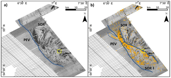 (a) Backscatter mosaic showing two sedimentologically different areas: “PEV” (paleo Elbe valley) with homogeneously distributed muddy fine sands and “SOR” (Sylt Outer Reef) with small-scale changes of fine sands and coarse sediments. Yellow box shows the location of the case study area. (b) Backscatter mosaic with positions of hyperbolas retrieved from the parametric sediment echo sounder data. Based on that, the SOR can be divided in a more stony (SOR I) and a more gravelly (SOR II) area.