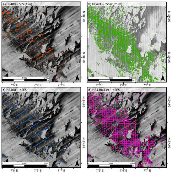 A differentiation of gravelly substrate and lag deposits by means of the backscatter on a larger scale is hardly possible. There are no differences in the backscatter values and typical ripple marks or stone signatures are hardly visible at a spatial resolution of 1 m (Figure 3). In the case study area with a spatial resolution of 0.25 m such signatures are apparent. The amount of stones identified manually from the two SSS mosaics differ significantly (844:11,079) (Figure 4a,b). Generally, the stones were identified on high backscatter data in the central part of the case study area. Almost no stones are present in the northeastern high backscatter area.