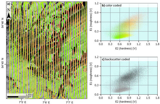 The AGDS data suggest a sediment distribution pattern similar to the low resolution SSS backscatter (Figure 5). The E1/E2-scatter plot indicates two clusters: (1) smoother and softer values which corresponds with low SSS-backscatter values (sand); and (2) rougher and harder values which corresponds with high backscatter data (gravelly substrate and lag sediments). Moreover, lag sediments with stones do not produce significantly different AGDS-values compared to rippled sandy gravel to gravel areas (Figure 5c).