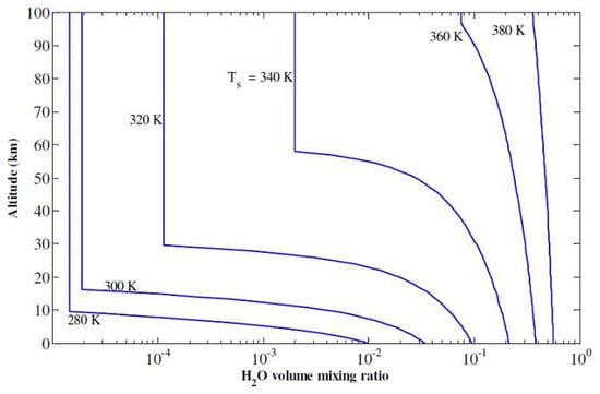 Vertical water vapor (volume) mixing ratio profiles for the Earth at different mean surface temperatures. An abrupt increase in the water vapor mixing ratio occurs at ~340 K, after which point the water vapor surface mixing ratio is ~20% [21] and the moist greenhouse is triggered (adapted from Ramirez [22]). The cold trap is often coincident with the tropopause, which separates the upper atmosphere from the convective region, “trapping” water vapor to lower atmospheric levels (i.e., below the tropopause).