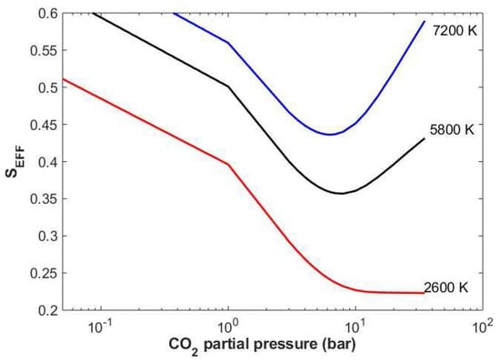Plot of the effective stellar flux (SEFF) versus CO2 partial pressure for F0 (7200 K, blue), G2 (5800 K, black), and M8 (2600 K, red) stellar types. SEFF decreases from the right to the curve minima because stellar radiation decreases farther away from the Sun, requiring a stronger greenhouse effect (higher CO2 pressures via the carbonate–silicate cycle) to maintain habitable surface temperatures. SEFF increases beyond the curve minimum because the planet cools at the larger distances associated with increased Rayleigh scattering and CO2 condensation. Thus, the maximum greenhouse effect of CO2 occurs at the curve minima (based on calculations from Kasting et al. [1] and Kopparapu et al. [26]).