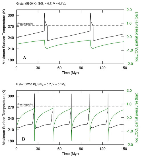 Maximum surface temperature (black curve) and pCO2 level (green curve) for an Earth-like planet with a volcanic outgassing rate 10% of that of Earth’s orbiting a G-star (A) and F-star (B) for SEFF = 0.7. Transient periods of warming during which temperatures exceeding the freezing point of water (dashed line) are followed by extended periods of global glaciation (adapted from Haqq-Misra et al. [79]).