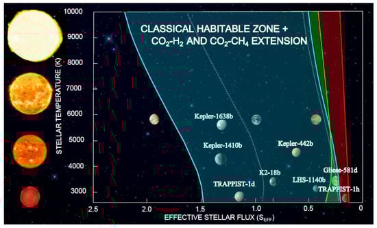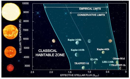 where T* = (TEFF − 5780) and Ssun is the SEFF value for a given HZ limit in our solar system. The quantities (a,b,c,d) are constants. However, the spectral range has recently been expanded to include A-stars (10,000 K) [2]. This extended classical CO2–H2O HZ, along with updated constants for Equation (6) (Table 1), is shown in Figure 5.