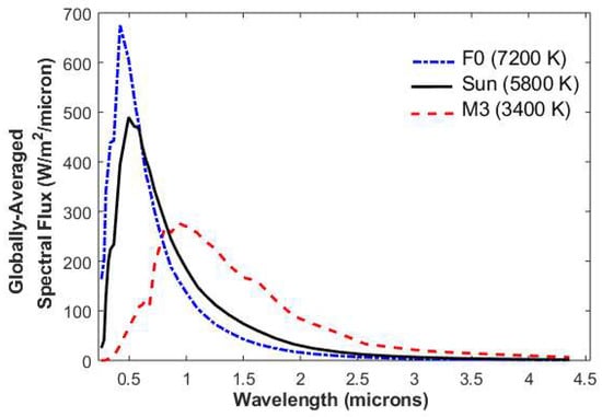 - Shields, A.L.; Meadows, V.S.; Bitz, C.M.; Pierrehumbert, R.T.; Joshi, M.M.; Robinson, T.D. The effect of host star spectral energy distribution and ice-albedo feedback on the climate of extrasolar planets. Astrobiology 2013, 13, 715–739. [Google Scholar] [CrossRef] [PubMed]