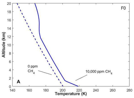 Another way to generate atmospheric hydrogen is through volcanism. Paleoclimate studies of early Earth and Mars show that volcanism could have outpaced H2 escape on both planets, maintaining clement conditions with H2 partial pressures as low as <1 bar [46,93,140,141]. This is because reduced mantle conditions could have favored enhanced outgassing of H2 over longer timescales. Unlike the previously described primordial hydrogen mechanism [129], hydrogen is not the major constituent, as losses to space are compensated by volcanism. In this mechanism, the background atmosphere foreign-broadens the hydrogen, which excites roto-translational bands, absorbing in additional spectral regions where CO2 and H2O absorb poorly [93,140,142,143,144]. On Earth, N2 was suggested to be this background gas [46], whereas for Mars, it could have been CO2 and N2 [93,140]. Nevertheless, CO2–H2 CIA is even stronger than that for N2–H2 CIA, requiring lower pressures to achieve warm surface conditions for the former atmospheric composition than the latter [141].