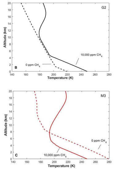 - Godolt, M.; Grenfell, J.L.; Kitzmann, D.; Kunze, M.; Langematz, U.; Patzer, A.B.C.; Rauer, H.; Stracke, B. Assessing the habitability of planets with Earth-like atmospheres with 1D and 3D climate modeling. Astron. Astrophys. 2016, 592. [Google Scholar] [CrossRef]