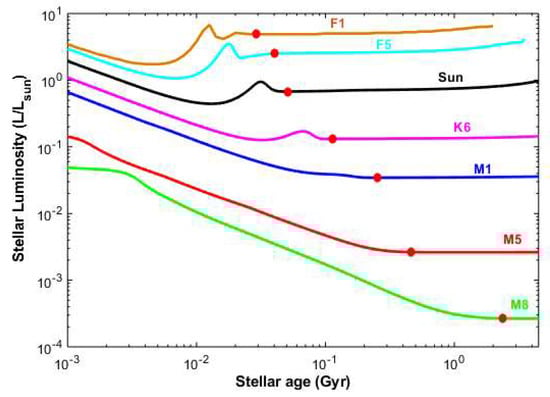 Previous calculations of the classical HZ had only computed boundaries for stars with main-sequence lifetimes >~1 or 2 Ga (F–M spectral classes) [1,26]. However, some argue (e.g., [2,130]) that such an HZ (e.g., [1]) may still be overly-pessimistic. For instance, we know that microbial life on our planet arose much more quickly than that (~700 Myr; [133]). Thus, main-sequence stars that last at least 700 Myr (which include A-stars with TEFF up to ~10,000 K) should be included in HZ definitions (e.g., [2,130,131]). After all, if a planet can sustain simple life, it is habitable (by definition), as originally defined by Kasting [1]. Again, it is possible that life emerges even more quickly than 700 Myr on other planets. For instance, evidence in zircons suggests that conditions on Earth may have been habitable by 4.3–4.4 Ga [74]. Overall, our own planet exhibits evidence that life can arise at least as quickly as 700 Myr, if not quicker.