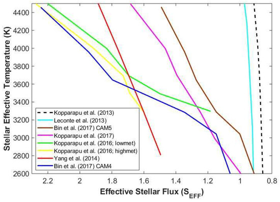 Classical HZ boundaries were originally computed for stars of TEFF = 2600–7200 (F–M stars) using the following fourth-order parameterization of the stellar effective flux (SEFF) [26]:
