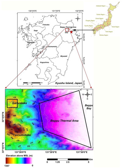 The Beppu geothermal area is situated at the eastern edge of the Beppu–Shimabara graben that crosses from northeast to southwest on Kyushu Island in Japan (Figure 1) [1]. Geologically, Beppu is one of the largest water-dominated geothermal systems in Japan, and it extends up from the Mt. Tsurumi–Mt. Garan volcanic center to the east coast of Beppu city, which is fed by geothermal fluid beneath the volcanic center of Mt. Tsurumi and Mt. Garan [2,3,4,5]. Beppu city is recognized historically as one of the largest spa resort areas on Kyushu Island, famous mostly for its onsen (hot spring bathing) and fumaroles [3,6]. The Beppu geothermal system is bounded by two striking faults at the north and south borders, almost along the east–west direction, and forms an alluvial fan in the center, made up by debris avalanches of andesite or dacite between the faults from the volcanoes behind [2,5]. Hydrothermal fluid flows along the two fault systems to the fan of the Beppu thermal area from the volcanic center, in southern and northern outflows known as the Beppu thermal zone and the Kamegawa thermal zone, respectively [7]. Beppu city is built up around the two thermal zones. Thermal activity consists of mud pools, fumaroles, and steam-heated ground in the thermal zones of the Beppu region and near the summits of Mt. Garan and Mt. Tsurumi [8]. Otherwise, there are two types of fumarolic activity near the summits of Mt. Garan and Mt. Tsurumi. Almost all hot springs disappeared due to intense drilling for water wells and the development of the town of Beppu during the early 1900s, except one natural hot spring exists today, Chinoike Jigoku (“blood pond hell”), on the northern side of the Kamegawa thermal area [5,9,10]. So far, the number of wells drilled for heated water is about 3000, and the flow rate of hot spring water is about 50,000 tons per day, including fumaroles of this area [2]. Thermal water is mostly extracted through 50–700 m deep boreholes below the surface of the Beppu thermal area [11]. A recent study of airborne thermal infrared data estimated about 20 and 1 MW heat discharge rate from Garandake and Tsurumi, respectively [12]. Hence, it is essential to explore and monitor the thermal status of the Beppu region to assess the sustainability of long-term use of hydrothermal fluids for many small-scale geothermal plants and direct use for tourist entertainment. Typically, there are some ground-based geothermal exploration and monitoring systems in this region, but such monitoring is expensive, time-consuming, and sometimes difficult to carry out due to high thermal ground or unstable areas and a natural park around the Beppu geothermal system. So far, there has been no research on heat loss from the Beppu thermal area and Mt. Garan fumaroles using nighttime satellite-borne thermal infrared data, although there are multispectral thermal infrared data from both day and night for this region that are freely available and can be used within a short time to monitor the spatial thermal heat loss of this region.