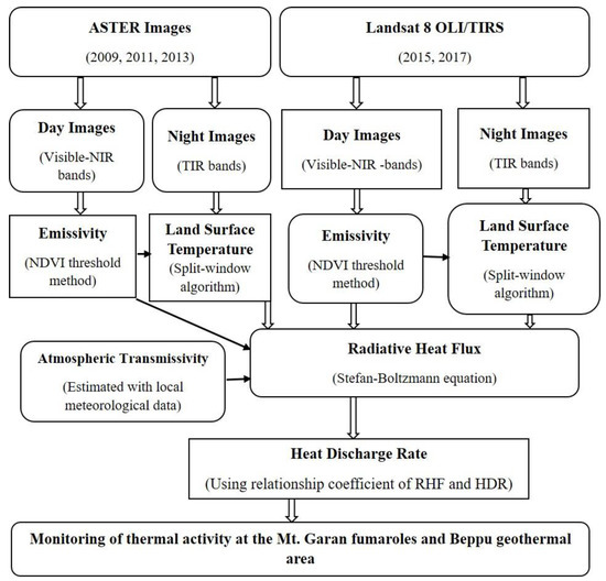 We used daytime and nighttime visible near-infrared and thermal-infrared images of two satellite sensors, ASTER and Landsat OLI/TIRS, in this study, considering the availability of good-quality images for the first time to explore and monitor heat loss from the Beppu geothermal area and Mt. Garan fumarole of northeast Kyushu Island from 2009 to 2017. We selected three pairs (day and night) of ASTER and two pairs (day and night) of Landsat 8 OLI/TIRS images considering cloud-free, good-quality, and same-season images of the study area (Table 1). The images were best quality (ranked 9 out of 9) (https://landsat.usgs.gov/landsat-8-l8-data-users-handbook-section-4) and 100% cloud-free, and were acquired from the United States Geological Survey (USGS) archives that were both radiometrically and geometrically corrected. Nighttime thermal infrared images were used in this study to avoid or reduce the solar effect to calculate geothermal heat loss from the volcanic thermal grounds. The daytime visible near-infrared images were used to retrieve the emissivity for each land cover of the study area, as emissivity is one of the important factors for heat loss retrieval from thermal ground. The ASTER satellite has 14 multispectral bands: three visible near-infrared bands of 15 m, six shortwave infrared bands of 30 m, and five bands of 90 m spatial resolution. The latest Landsat 8 satellite carries OLI and TIRS sensors, ensuring continuity of image collection, which have nine OLI bands of 30 m image resolution and three TIRS bands of 100 m resolution. We also acquired ASTER standard products (Emissivity, AST_05; Surface kinetic temperature, AST_08) from the land processes distributed active archive center (LP DAAC) of USGS for validating the heat loss monitoring from the study areas. The meteorological data, such as relative humidity and ambient temperature, were collected from the Japanese Automated Meteorological Data Acquisition System (AMeDAS) Oita station, and these data were later adjusted with altitude variation between the station (4.6 m above mean sea level) and the Mt. Garandake fumaroles (1045 m above mean sea level) and the Beppu thermal area using the international standard atmospheric (ISA) method [6,26,27] (Figure 1).