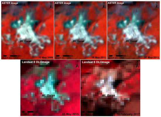 Top row: False color composite of red/green/blue (RGB) of NIR-visible bands of ASTER satellite images of the Mt. Garan fumarole area for 2009, 2011, and 2013. Bottom row: Band composite of RGB of NIR-visible bands of Landsat 8 OLI of the Mt. Garan fumaroles for 2015 and 2017.