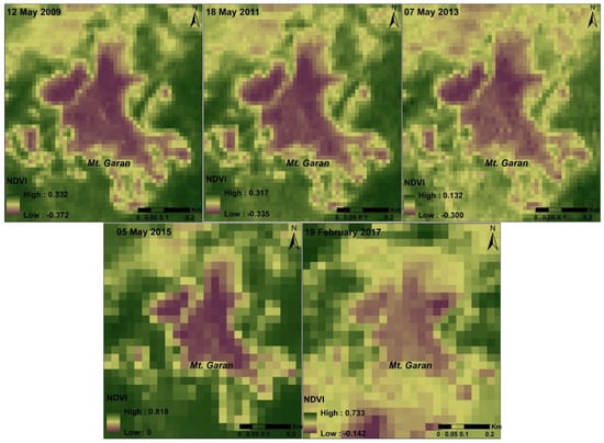 Normalized differential vegetation index (NDVI) of the Mt. Garan fumaroles area from 2009 to 2017. Higher NDVI values indicate healthy vegetation and lower values indicate bare land.
