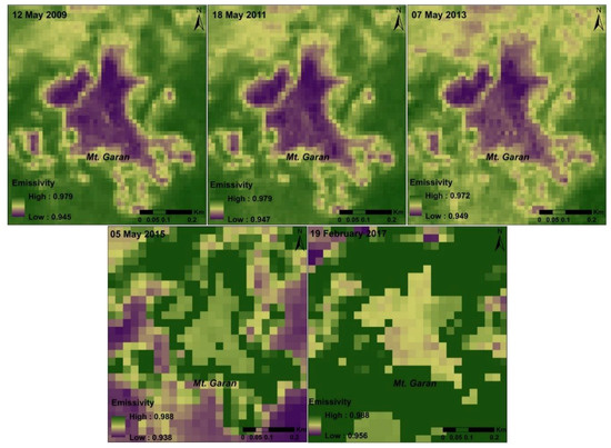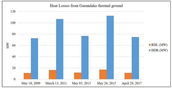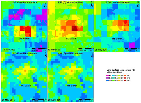 Land surface temperature is the main component of heat loss measurement from volcanoes or volcanically thermal ground. Higher spatial resolution of the thermal infrared band is the best option for detailed or accurate results of thermal anomalies or heat loss component. ASTER or Landsat 8 thermal infrared data consist of moderate-resolution images (resampled 30 m of original 90–100 m TIR data) and are used nowadays effectively for the thermal mapping of volcanoes. We estimated the thermal features, i.e., land surface temperatures, of the study areas with the ASTER and Landsat 8 TIRS data using a split-window algorithm with two thermal bands of ASTER (bands 13 and 14) and Landsat 8 TIRS (bands 10 and 11) images. We obtained a higher LST anomaly without ambient temperature within the Garandake fumaroles area than the surrounding area in all five sets of thermal images from 2009 to 2017. The highest LST without ambient temperature in the Garandake fumaroles was about 11 °C in 2011 and the lowest was about 7 °C in 2017 (Figure 7; Table 3). The thermal anomaly area was also the highest in 2011 and the lowest in 2017.