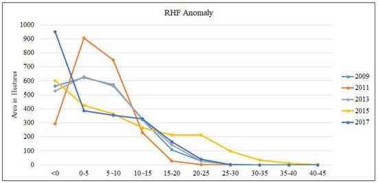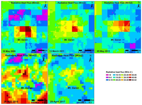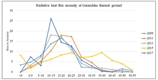 Radiative heat flux is one of the components of heat loss from volcanoes that can be measured using satellite thermal infrared sensors. We applied the Stefan–Boltzmann law of thermal heat loss to estimate RHF using skin land surface temperature of the Garandake fumaroles from 2009 to 2017 derived from the ASTER and Landsat 8 thermal infrared data. The highest pixel RHF value was within the range of 47 to 53 W/m2 from 2009 to 2015, and 38 W/m2 in 2017 (Figure 8; Table 3). The highest maximum RHF value was about 53 W/m2 in 2015 and the lowest maximum RHF was about 38 W/m2 in 2017. The highest anomaly area of radiative heat flux was found in 2011 and the lowest in 2017. After adding all positive RHF values of the Garandake thermal ground, we obtained the highest, about 17 MW radiative heat loss (RHL) in 2015, and the lowest, about 11 MW in 2009 (Table 3). Otherwise, we obtained RHL of about 16, 12, and 12 MW in 2011, 2012, and 2017, respectively (Figure 9). Then the total heat loss or heat discharge rate (HDR) of the Garandake fumarolic area was estimated after multiplying total RHL by a relationship coefficient between RHF and HDR. We obtained the highest heat loss of about 112 MW in 2015 and the lowest of about 73 MW in 2009 (Table 3; Figure 9). There were two consecutive peaks of heat loss from the Mt. Garan fumaroles, one in 2011 and the other in 2015 (Figure 9). In the higher ranges of RHF anomaly, the maximum was in 2015 and the lowest in 2017; the mid-ranges of RHF anomaly were the highest in 2015 and lowest in 2009, and the lower range of RHF anomaly were at the maximum in 2017 and minimum in 2015 (Figure 10).