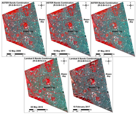 Top row: False color composite of RGB of NIR-visible bands of ASTER satellite images of the Beppu geothermal area for 2009, 2011, and 2013. Bottom row: Band composite of RGB of NIR-visible bands of Landsat 8 OLI of the Beppu geothermal area for 2015 and 2017.