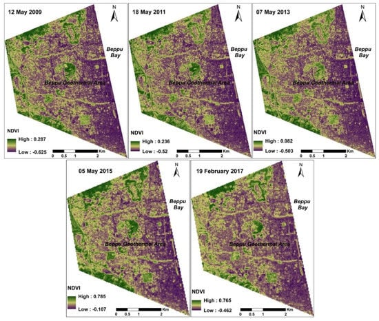 Normalized differential vegetation index (NDVI) of the Beppu geothermal area from 2009 to 2017. Higher NDVI values indicate healthy vegetation and lower values indicate bare land or urban areas.