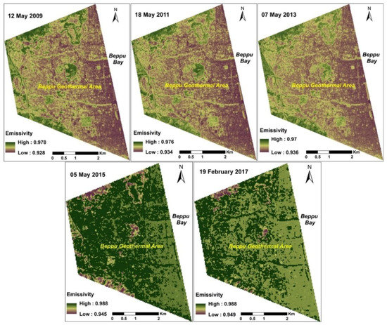 The Beppu thermal area covers almost all of Beppu city. A false color composite map of the Beppu thermal area shows vegetation as red, urban areas as bluish green, and water bodies as blue for ASTER and Landsat OLI images from 2009 to 2017 (Figure 11). Spectral emissivity is an important component to be considered for heat flux estimation in any volcanic or thermal area. We estimated the spectral emissivity of the Beppu thermal area using the NDVI threshold method for respective thermal bands of ASTER and Landsat 8. NDVI is derived using the red and near-infrared bands of daytime images of ASTER and Landsat OLI images of the Beppu thermal area from 2009 to 2017 (Figure 12). NDVI values range from −1 to +1. A higher positive NDVI indicates healthy vegetation, and negative or close to zero indicates bare or urban area or mixed land. We obtained an average spectral emissivity of the Beppu geothermal area from 0.93 to 0.99 (Figure 13). The higher value indicates healthy vegetation and the lower value indicates bare or urban or mixed land of the Beppu geothermal area.