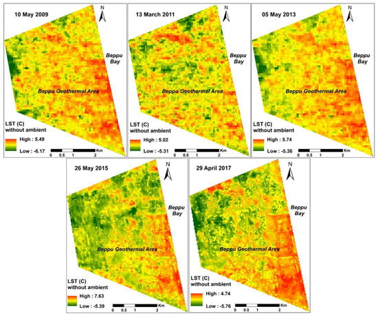Land surface temperature without ambient temperature of the Beppu geothermal area, derived from nighttime ASTER infrared data using split-window algorithm for 2009, 2011, and 2013 (top row), and derived from nighttime Landsat 8 TIRS data using split-window algorithm for 2015 and 2017 (bottom row).