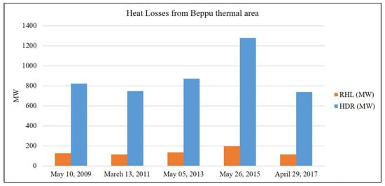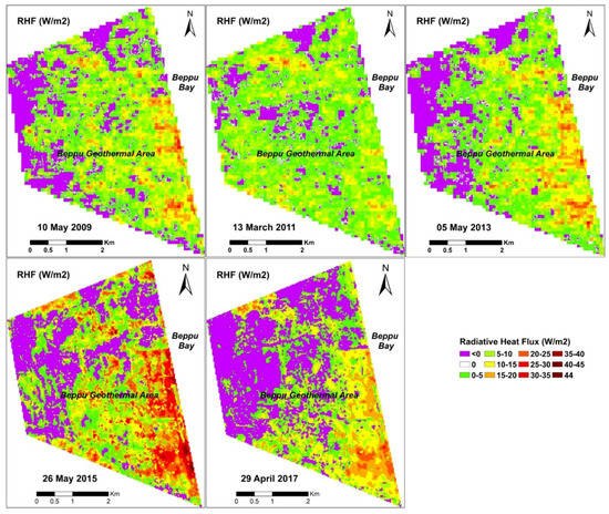 Land surface temperature was estimated after applying the split-window algorithm with the nighttime thermal infrared data of ASTER and Landsat 8 TIRS images of the Beppu geothermal area from 2009 to 2017 (Figure 14). The highest LST without ambient temperature was about 8 °C in 2015. Higher thermal anomalies were obtained along the southeastern coast of the Beppu thermal area. Radiative heat flux was estimated using the derived land surface temperature of ASTER and Landsat 8 thermal infrared bands after applying the Stefan–Boltzmann law of heat flow. The highest maximum RHF was about 45 W/m2 in 2015 and lowest maximum was about 25 W/m2 in 2011. The range of RHF was 25–30 W/m2 from 2009 to 2017, except in 2015, when it was about 45 W/m2 (Table 4). Higher RHF anomaly was observed in the southeastern part of the Beppu thermal area (Figure 15). Total radiative heat loss was estimated after summation of all positive RHF pixels. The highest RHL was about 197 MW in 2015 and the lowest about 114 MW in 2017. Otherwise, total RHL was about 127, 115, and 134 MW in 2009, 2011, and 2013, respectively (Table 4). The highest total heat loss or heat discharge rate was in 2015, about 1279 MW, and the lowest was about 739 MW in 2017 (Figure 16). Dividing the RHF anomaly areas into three parts, high, moderate, and low, we found that the high heat loss anomaly area converged to maximum in 2015, the moderate anomaly area in 2017, and the lower RHF anomaly area in 2011 (Figure 17).