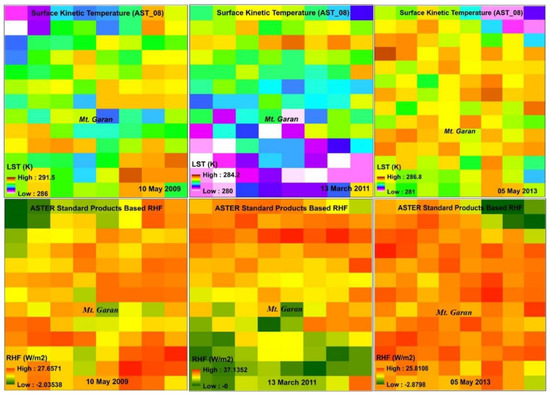 High level ASTER product of surface kinetic temperature (AST_08) of the Mt. Garan fumaroles from 2009 to 2013 (top row). RHFs are retrieved from the ASTER standard products of emissivity (AST_05) and surface kinetic temperature (AST_08) from 2009 to 2013 of the Mt. Garan fumaroles, shown in the bottom row.