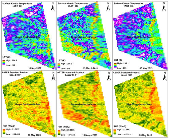 High level ASTER product of surface kinetic temperature (AST_08) of the Beppu geothermal area from 2009 to 2013 are shown in the top row. RHFs are retrieved from the ASTER standard products of emissivity (AST_05) and surface kinetic temperature (AST_08) from 2009 to 2013 of the Beppu geothermal area, shown in the bottom row.