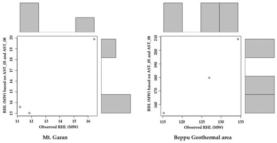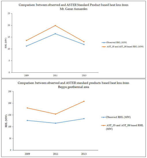 ASTER standard products were used to validate in this study, just for the results of LST and RHL, retrieved using ASTER images for both study areas. We used nighttime high level products of emissivity (AST_05) and surface kinetic temperature (AST_08) to retrieve LST and RHF for the year of 2009, 2011 and 2013 to validate the results of observed heat loss from both Mt. Garan fumaroles and Beppu geothermal area in this study (Figure 18). Although the anomalies of LST and RHF are not closely matched between the results of observed and standard products of ASTER (may be due to the resolution difference 15 and 90 m respectively for observed and standard), but the total RHL showed similar pattern and close to the observed total RHL of the study areas (Figure 18, Figure 19 and Figure 20) (Table 5). We analyzed the Pearson correlation coefficient between total RHL based on ASTER standard products and observed total RHL, and obtained strong correlation (0.9822 for Mt. Garan and 0.9881 for the Beppu geothermal area) between them for the study areas (Figure 21; Table 5). The variation between total RHL based on ASTER standard products and observed total RHL may be related with the atmospheric profile and altitude differences. We used the local Oita meteorological station’s data (AMeDAS, used to acquire atmospheric data in every 10 min) with the same time of the image acquisition in our study, but the meteorological station is located about 15–20 km southeast of the study area. We were also adjusted the altitude variation of atmospheric ambient temperature for the whole Beppu area using a single altitude (284 m as average) for the whole Beppu region. Hence, the total RHLs are varied more between observed and ASTER standard product’s base RHL in the Beppu geothermal area (large area with varied topography) than Mt. Garan fumaroles (small area and more or less uniform topography) (Figure 20).
