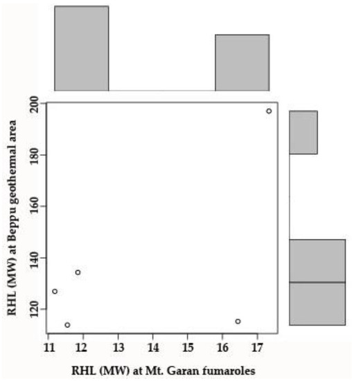Scatter plots and histogram of RHL between Mt. Garan fumaroles and Beppu geothermal area.