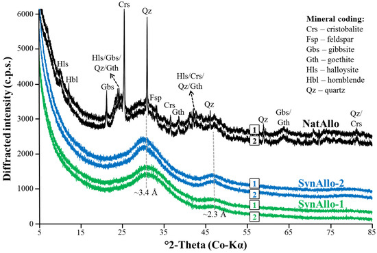 XRD analysis confirmed the dominance of allophane in NatAllo (~78 wt.%; [24,29]), which also contains minor quantities (each <5 wt.%) of quartz, cristobalite, feldspar (albite and orthoclase), hornblende, halloysite, gibbsite, and goethite (Figure 1). The XRD patterns of SynAllo-1 and SynAllo-2 exhibited two broad peaks centered at ~3.4 Å and ~2.3 Å, which is typical for short-range ordered aluminosilicates such as allophane. No indication for the formation of amorphous silica or discrete Al–O–OH phases such as boehmite and gibbsite was found in the synthetic precipitates, implying that SynAllo-1 and SynAllo-2 consist solely of allophane. However, in these samples, the presence of traces of amorphous Al-hydroxides cannot be excluded. The XRD patterns of natural and synthetic allophanes sorbed with ions (for the experiments with aqueous Ba, Co, and Sr, similar patterns were obtained, but are not shown) do not reveal the formation of discrete Ba(II), Co(II), Sr(II), and Zn(II) oxyhydroxides, suggesting that chemical precipitation is negligible.
