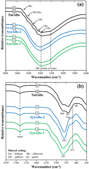 Attenuated total reflectance Fourier transform infrared (ATR-FTIR) spectroscopy data were obtained for further characterization of the allophanes by a PerkinElmer Frontier FTIR (Waltham, MA, USA). Mid-infrared (MIR) spectra were recorded in the range from 4000−650 cm−1 at a resolution of 2 cm−1.