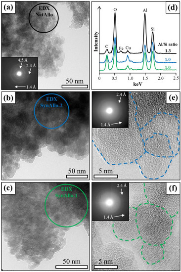Allophanes are classified by their atomic Al/Si ratio, with Al-rich proto-imogolite allophane or imogolite-like allophanes (Al/Si = 2) and Si-rich halloysite-like or pumice allophanes (Al/Si = 1) as the members [19]. TEM-EDX analysis of cloud-like particle aggregates of NatAllo yielded an averaged atomic Al/Si ratio of 1.3 ± 0.2 (Figure 3d), corroborating the atomic Al/Si ratio of 1.3–1.4 for Ecuadorian allophane previously reported in Kaufhold et al. [24]. Such allophanes are very often referred to as “stream deposit allophanes” or “silica springs allophane”, according to Parfitt [19]. Minor amounts of Fe in NatAllo (Figure 3d) most likely belong to fine-grained goethite particles, being dispersed in the allophane aggregates. The atomic Al/Si ratio of the synthetic allophanes was determined as 1.0 ± 0.1 (Figure 3d), which is close to the Si-rich member.