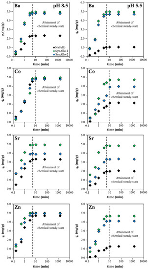 The effect of contact time on the adsorption behavior of aqueous Ba, Co, Sr, and Zn by allophane adsorbents was investigated at pH values of either 8.5 or 5.5 (reflecting the observed minimum and maximum adsorption efficiencies; see Section 3.3.3.). It can be inferred from Figure 4 that the metal ion uptake by allophane increased significantly within 3–5 min, but it slowed down afterwards because of both a decrease in the binding sites of the adsorbents and a decrease in the metal ion concentration in solution. More specifically, for aqueous Ba, Sr, and Zn, adsorption has been completed within less than 5 min at pH 8.5 (Table 1), while aqueous Co needed 10 min to reach equilibrium. As expected, the removal efficiency strongly decreased and the time to reach adsorption equilibrium increased at decreasing pH (Table 1). This is because the ≡Al–OH° and ≡Si–OH° groups are more protonated under acidic conditions and potential binding sites are less available to retain metal ions [30].