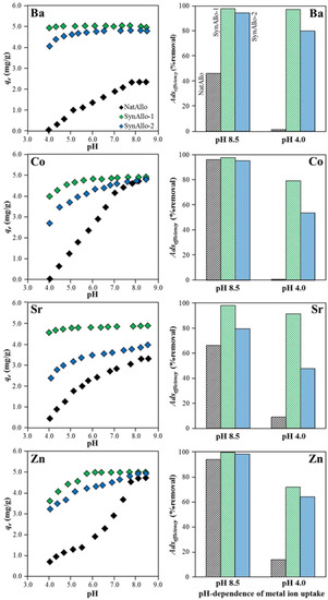 Metal ion uptake by allophane depends mainly on pH as acidity affects the aqueous speciation of the metal ions and the (de)protonation degree of the functional ≡Al–OH° and ≡Si–OH° groups at the allophane surface [19,30,35]. Figure 5 presents the evolution of the amounts of aqueous Ba, Co, Sr, and Zn adsorbed on allophane from pH 4.0 to 8.5. The corresponding metal ion removal efficiencies at pH 8.5 and pH 4.0 are reported in Table 1. Metal ion uptake by NatAllo was low at pH ≤ 5.0, followed by an adsorbate-dependent increase at pH 5.5 to 7.5 and attained a maximum at pH ≥ 8.0 (Figure 5). SynAllo-1 revealed the highest removal efficiency (i.e., ≥95% removal) for aqueous Ba at pH 4.0–8.5, Sr at pH 4.5–8.5, Zn at pH 5.5–8.5, and Co at pH 6.0–8.5. SynAllo-2 displayed lower removal efficiencies than SynAllo-1, but it exhibited a good performance at pH ≥ 7.0. NatAllo showed the highest pH-dependency for the metal ion uptake (Figure 5).