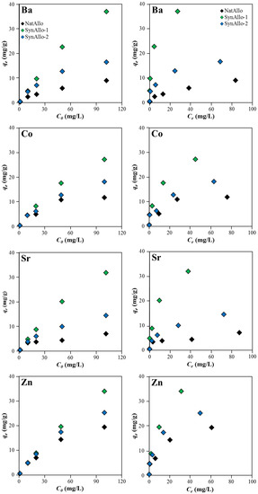 Figure 6 (right panel) shows the plots of adsorption quantities versus the metal ion concentrations at equilibrium for the removal of aqueous Ba, Co, Sr, and Zn by the allophane absorbents at pH 8.5. The isotherms initially increase sharply at low metal ion concentrations, which suggest that plenty of binding sites are available for adsorption. At higher metal ion concentrations, however, the curves become more flattened, which indicates that no more binding sites at the allophane surfaces are available for further adsorption and that a certain adsorption maximum has been reached. Over the last decades, a huge variety of models have been developed to describe adsorption isotherms, but the most commonly used models are the Langmuir, Freundlich, Dubinin–Radushkevich (D–R), and Redlich–Peterson models. The advantages, disadvantages, and limitations of these models are discussed in detail in the review paper by Tran et al. [16]. In this study, the Langmuir equation and the D–R model are used to describe the isotherms, because these models are considered to properly describe the adsorption on porous and heterogeneous materials with known surface characteristics, as for allophane. The linear form of the Langmuir model [38] is defined as Equation (4).