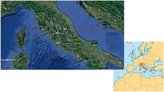 The areas under investigation were in the cities of Amelia (in the province of Terni) and Rome, 90 km and 150 km away from the epicenter of the earthquake in Norcia (Italy), respectively. The places in which the GPR surveys were conducted included: (i) a private house in the center of Amelia, and (ii) the Marconi Bridge—one of the busiest bridges in Rome, located on the River Tiber (Figure 1).