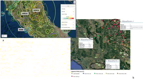 The Italian Accelerometric Network (RAN), managed by the Department of Civil Protection (DPC), and the Italian Seismic Network, managed by the Istituto Nazionale di Geofisica e Vulcanologia (INGV) provided the records of about 650 accelerometric stations. In Figure 2, thanks to both the Italian strong-motion database, ITACA (Italian Accelerometric Archive (http://itaca.mi.ingv.it)) and the USGS database (http://earthquake.usgs.gov), it is possible to calculate the peak ground acceleration (PGA) at the epicenter and at the two study areas (Amelia and Rome). These were 536.48, 18.28, and 24.29 cm/s2, respectively [,,].