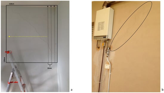 In the private apartment in Amelia, a visibly damaged wall was analyzed to understand the internal geometry of the fracture that was assumed to pass through the masonry from the inner part of the apartment to the outer part, which was on the balcony. This type of investigation is well documented in the literature [,,,,,,], but less used in the post-earthquake situation. The whole house was built in the 1970s, before the new anti-seismic rules and before the modern development of the seismic vulnerability map. The building is a hybrid structure, masonry and reinforced concrete, and this was the most evident and critical crack.