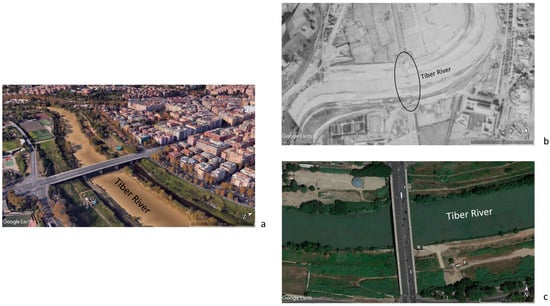 The Marconi Bridge on the River Tiber within the urban context of Rome (a,c); (b) The beginning of its construction after WWII (source: Google Earth).