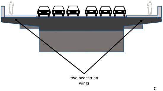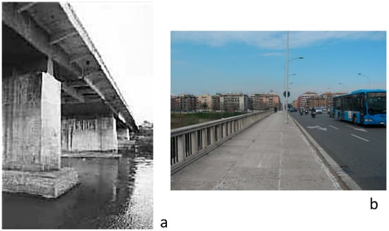 (a) The “winged” structure of the Marconi Bridge; (b) Note the difference between the sidewalk (covered by travertine) and the road (covered by the asphalt); (c) Schematic illustration of a section of the Marconi Bridge.