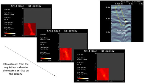 Figure 7 shows the single profile acquired inside the above-mentioned grid and the depth-slices that clearly illustrate the presence of an oblique anomaly, which probably corresponds with the fracture visible on the masonry. It is worth noticing that this fracture passes through the masonry from side to side, to affect the outer wall of the room, also on the balcony side. The last slice in Figure 8, acquired from inside the room at about 0.5 m depth coincides in shape and geometry with the fracture visible outside on the balcony. Thanks to the penetration capacity and the resolution of the GPR, it was possible to understand not only the internal geometry of the fracture but also its gravity, and it facilitated the restructuring that prevented the collapse of the wall and the possible damage to property and people. Given its sudden appearance of this crack following the Norcia 2016 earthquake and its peculiar nature it is also closely related to the similar post-seismic damage found in the area in other buildings [].