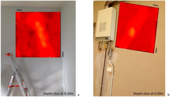(a) The depth-slice at 0.2 m inside the masonry, revealing its inner geometry; (b) The depth-slice at 0.5 m of the same crack in the wall from the balcony.